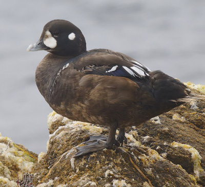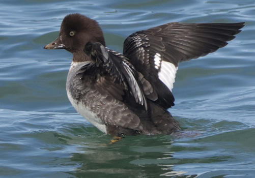 Missed on count day, but present during and after the CBC, were two Orchard Orioles, a female Baltimore Oriole, and a female Hooded Oriole (all in the Hawthorne neighborhood, Monterey), and on the ocean off Del Monte Beach, Monterey, this first-year female Barrow's Goldeneye (photo right, 24 Dec, © Kai Russell). |
