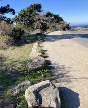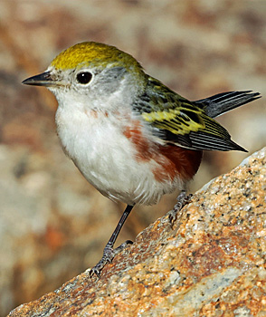 Even later was an unexpected and beautifully marked Chestnut-sided Warbler (below) in the dirt parking strip at the Majella Creek willow patch, across Sunset Drive from the south end of Asilomar conference grounds, Pacific Grove, from 7-11 December. Found by Linda & Steve Sargent, its behavior was most unusual. It spent its time foraging in crevices among a line of rocks demarcating the inner edge of the dirt parking lot (below, left). Occasionally it would hop up onto a rock (below, center ) but mostly around the base of each rock, eating termites (below right, all photos 8 Dec, © Don Roberson). |