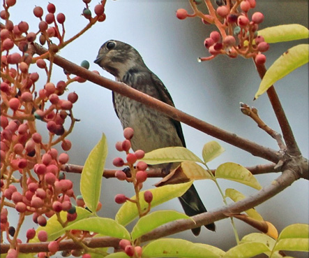 In mid-September, Santa Clara County hosted a Dark-sided Flycatcher (Muscicapa sibirica) in Palo Alto. The species breeds north into Siberia (sometimes called "Siberian Flycatcher") and migrates to southeast Asia. This was an unexpected first for California and for the lower continental 48 states! Such a "mega" rarity was chased by birders from across the continent. It was found on a Wednesday (17 Sep), but only Bay Area observers got there that day. During the next two days (18-19 Sep), members of the Monterey and Santa Cruz birding communities made it to the Google parking lot, where the Old World flycatcher sometimes foraged in fruiting Chinese Pistache trees (ph right, 18 Sep © Don Roberson). Alas, it left before the weekend. Looking at eBird lists, I think at least 14 of the MTY birders made this successful pilgrimage. |