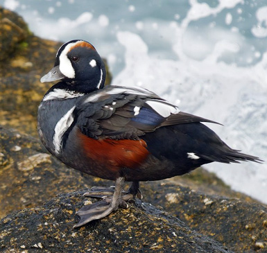 A male Harlequin Duck wintered at Bird Rock, Pebble Beach, and then undertook a full eclipse molt, presumably with a flightless period, starting in July and completed in September. By October it was fully resplendent again. Mark Chappell documented all stages of this molt. Shown here, at left, was the Harlequin Duck on 8 August and on 1 October (both © Mark Chappell). |