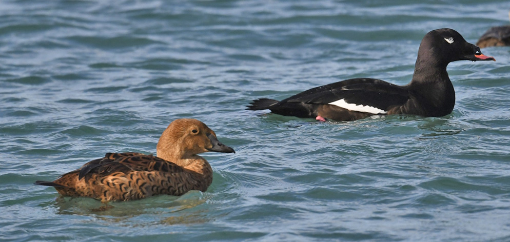 On 15 November, Steve Tucker discovered a female King Eider among the Surf Scoter flocks off the Moss Landing jetties. Initially, it foraged close to shore south of the south jetty, but during its two week stay (15-30 Nov) spent the latter half mostly north of the north jetty, where Cooper Scollan took this photo (above, 27 Nov, © Cooper Scollan). By the end of its stay a couple of White-winged Scoters and a Black Scoter were also present. Literally hundreds of observers came to see the eider, and many obtained fabulous photos, but I particularly liked this combination shot with a male White-winged Scoter.