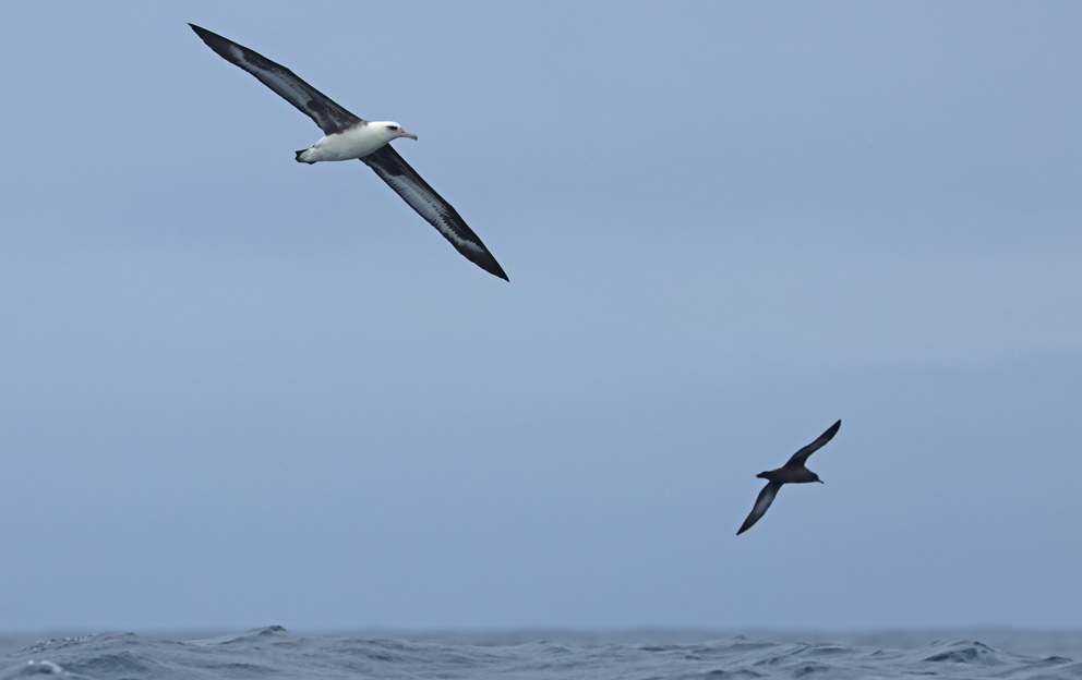 Monterey Bay and offshore waters from July into October were generally warmer than average. Guadalupe Murrelet — usually the scarcest of Synthliboramphus murrelets in MTY — were present in numbers from research cruises far offshore in July, and others were spotted on public pelagic trips into September (right, 28 Sep © Don Roberson). Laysan Albatross used to be found mostly on winter boat trips, but now they can occur in any month, as exemplified by this one 20 miles west of Pt. Sur, with a Sooty Shearwater, on 28 Sep (above, © Don Roberson).