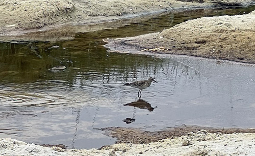 | In June, two rare White-rumped Sandpipers were found in MTY (for details, see the highlights of the first half of 2025). The first White-rumped was at a tiny pool created by the outflow of Majella Creek mouth on the sandy Asilomar State Beach. Since then, starting in July and again in August, local birders were seen pointing cameras at that same puddle (photo below left from June, © D. Roberson). That's because other rarities stopped at this tiny pool of freshwater. One example was this Pectoral Sandpiper (below right, on 20 Aug, ph © Rita Carratello, showing the size of this pool). Scarcer shorebirds at this spot in July included a juvenile Semipalmated Sandpiper from 24-27 July (2d row below, left; ph 24 July © Mark Chappell) and a breeding-plumaged Red Knot, found by Kai Russell, on 28 July (2d row below, right, ph 28 July © Don Roberson). |
