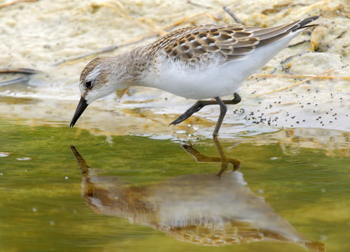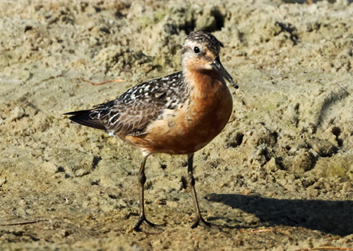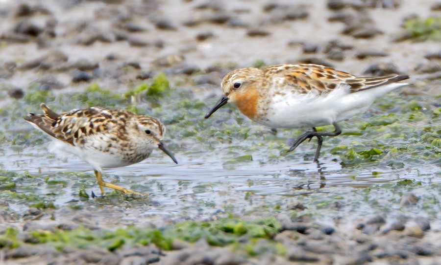 | Although the run of diverse waders at Asilomar SB was a great time for locals, fall migration's best shorebird was a breeding-plumaged Red-necked Stint along Jetty Road in Moss Landing, found and first reported by visitor Jay Withgott on 20 July. Since this was a continental rarity, eager birders arrived from far and near. One visitor, Keaton Schneeflock, was spurred to look through the photos he had taken on Jetty Road on 19 July — and he discovered he had inadvertently photographed the Red-necked Stint as well! So its entire stay turned out to be 19-21 July 2025. The Red-necked Stint would forage at low tide with hundreds of other small Calidris sandpipers, and could be hard to find and photograph. The photo I like best is this one (above) by Mark Chappell, shows it near a breeding-plumaged Least Sandpiper (photo 21 July, © Mark Chappell). This is just the second record for MTY; the first was in the Moss Landing salt ponds on 13-14 July 2001 (see Plate 7 in Monterey Birds, 2d ed., Roberson 2002). |