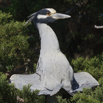Our continuing Yellow-crowned Night Heron, having proven to be an adult male this summer by mounting a female Black-crowned Night Heron at Pt. Lobos in an attempt to breed (it was late in the season and the nesting attempt failed), continued his winter pattern of returning to the row of cypresses at Stillwater Cove, Pebble Beach, in November. After the Pt. Lobos breeding attempt, "Nick" showed up at Stillwater Cove from 5 August to 7 October, but then disappeared again for over a month. Just like last October, "Nick" appeared in the night-heron rookery at Elkhorn Ranch in Moss Landing! This was documented with photos on 11-12 October (photo right, 12 Oct, © Jim Krill). How our night heron discovered both the Elkhorn Slough and Pt. Lobos breeding rookeries is a mystery. Do herons have an internal Green Book ? (a stray reference to the 2018 film of that name).
